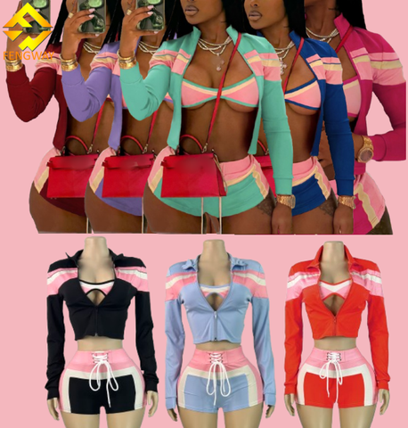 Summer Clothes 3 Piece Set Women's Tracksuit Streetwear Contrast Color Sports Bra Jacket and Shorts Sets for Women Loungewear